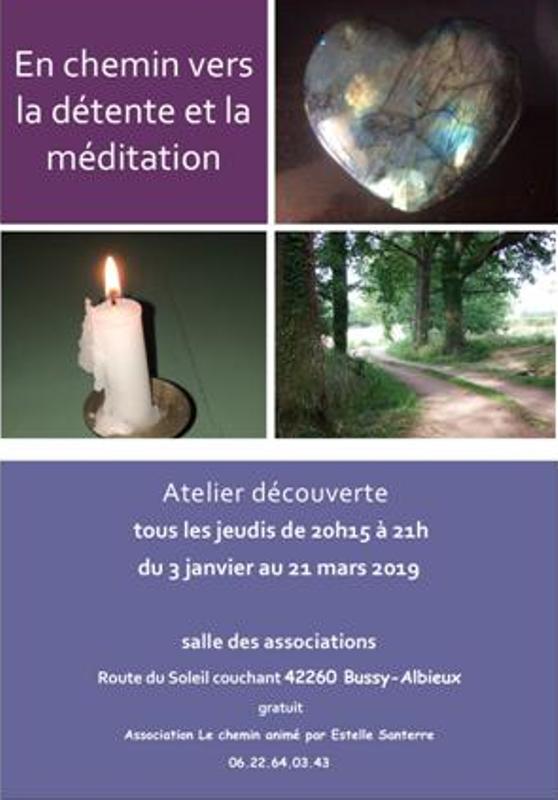 Les ateliers de méditation sont les jeudis de 20h15 à 21h du 3 janvier au 21 mars 2019, dans la salle des associations, route du soleil couchant à Bussy Albieux.